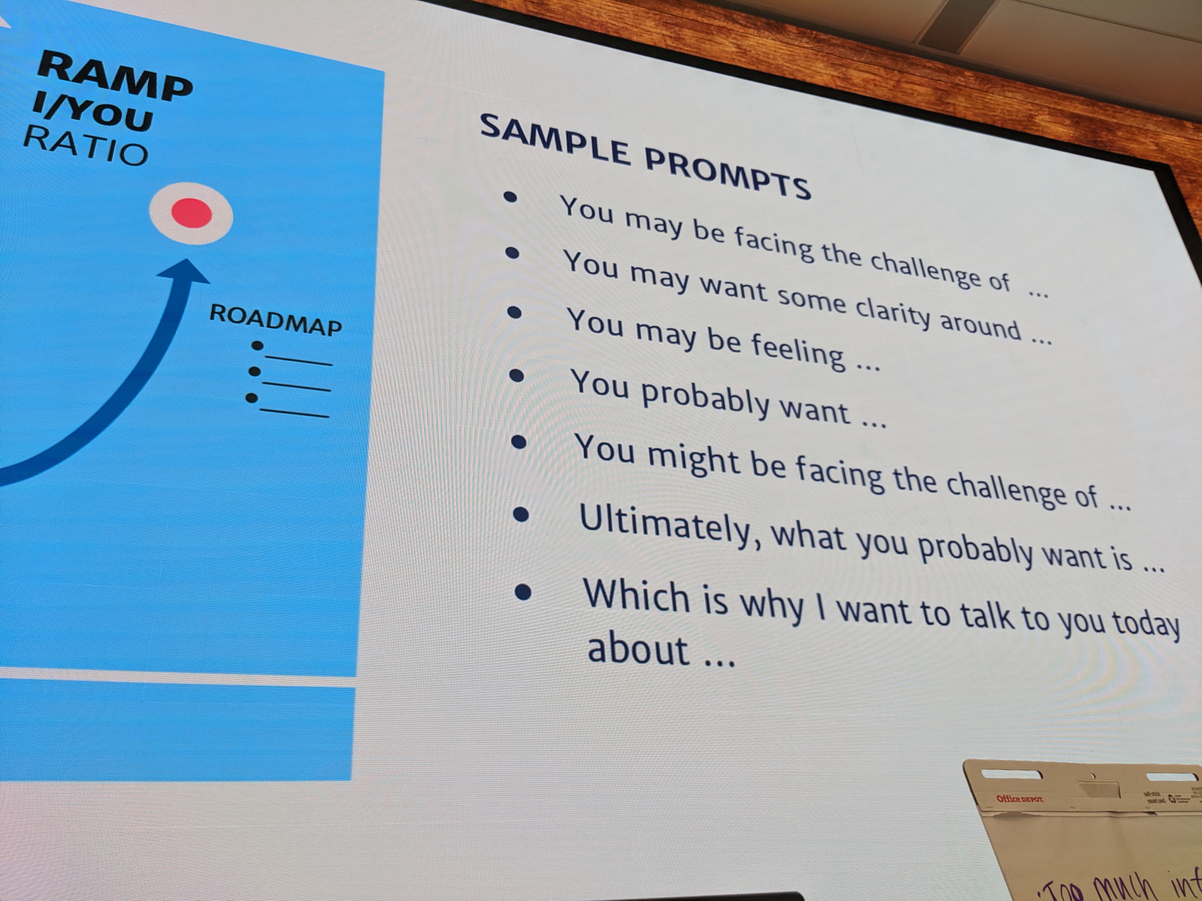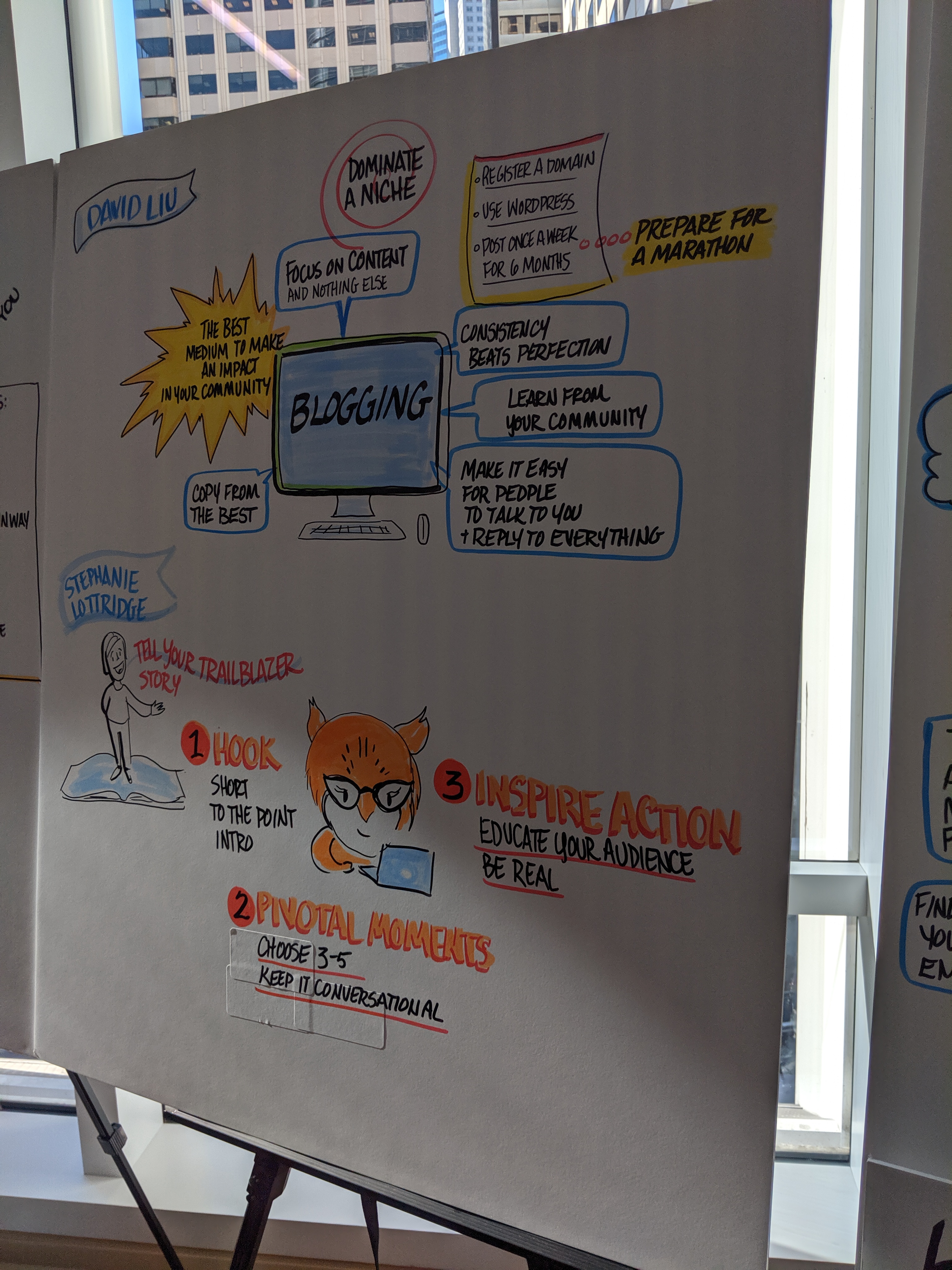 I’ve got to give a huge shout out to this team. This presentation was AWESOME. Amazing even! They walked us through how to prepare our state of mind, which influences our delivery, which influences our content. We practiced the art of storytelling in small groups, using the tools they were giving us and then providing feedback to one another. When we left this session, I was so pumped up. One of my favorite things was the concept of the I/You ratio. Naturally, when we start telling a story, its all about I. I did this and I’m going to tell you this and I I I I I. Its hard for your audience to engage when they aren’t invested. But if you flip that to YOU, then its about them. Some example prompts they suggested: