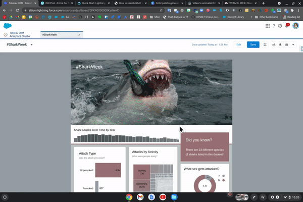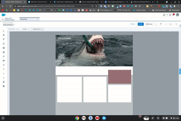 Did you know there’s a shark themed badge on Trailhead? It’s a project about hunting prospects and closing deals lightning fast. And it has a shark fin circling money on the badge, so that’s rad. But I’m not a closer, I’m a builder, and I’ve been watching #sharkweek all week on Discovery. Have you?! I really loved their new show, Shark Academy, where 8 people were training to join a shark expedition. And I loved Brad Paisley playing his guitar under water – that was super fun.