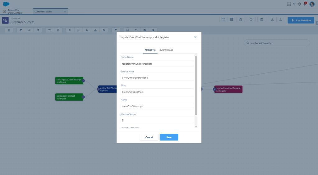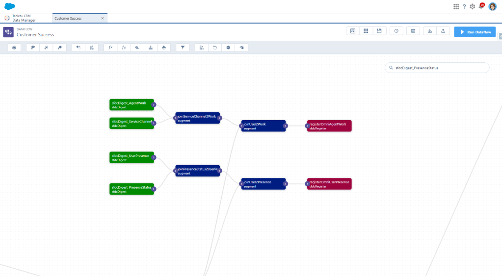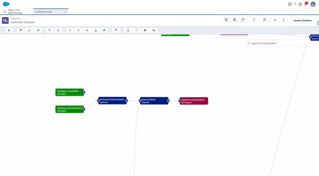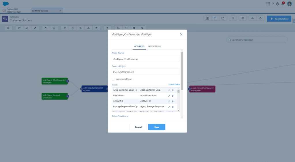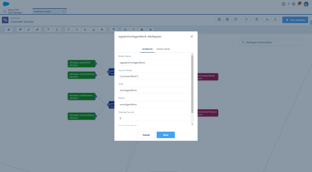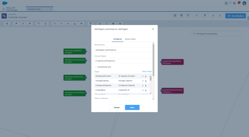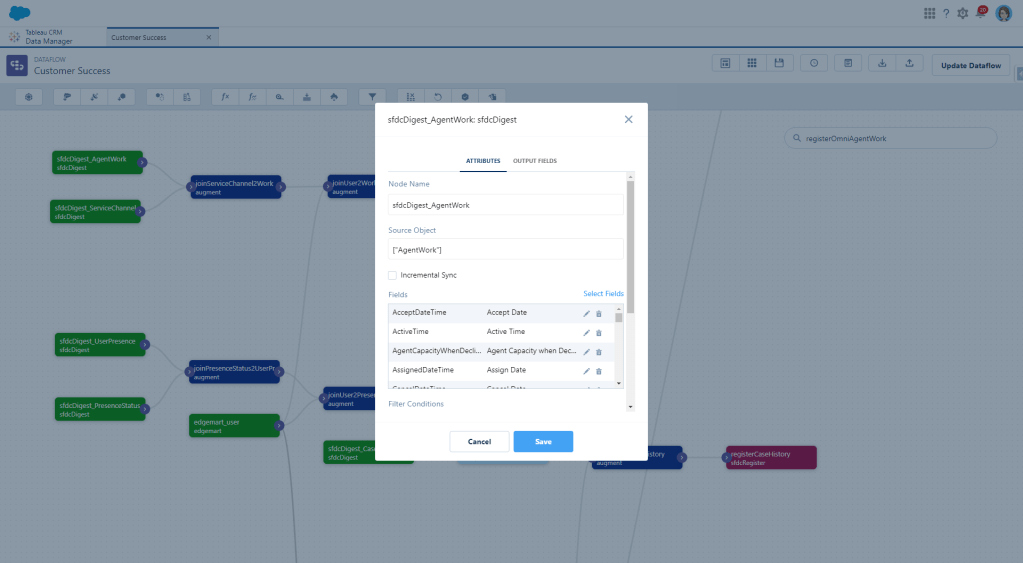 First we need to create a digest node for the AgentWork object. I’m pulling in most fields right now until I figure out what I actually need and what I don’t because I hate having to go back and grab another one and then wait for the dataflow to run again.