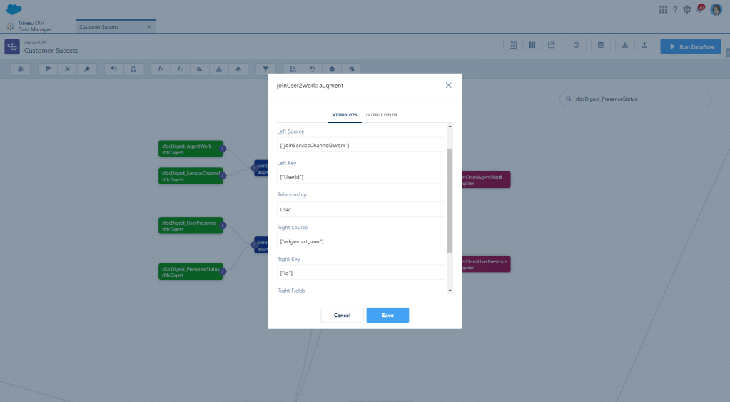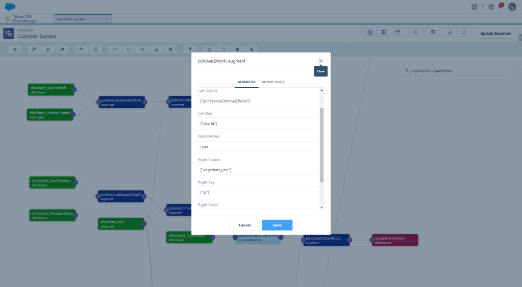 Since I have a lot of things on my list about agent productivity, I need to know who the agent actually is. As it stands, we only have a User Id, so now we need to augment User data too, using that UserId field as our key. Since I’m adding these nodes to an existing dataflow, I already have user data available. If that’s not the case for you, just do another digest of your User object.