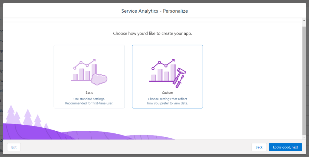 This option also lets you select things like Knowledge, Telephony, CSAT, and Business Hours! Continue going through all the menu items and answer questions about your data and then finish to start creating the app.