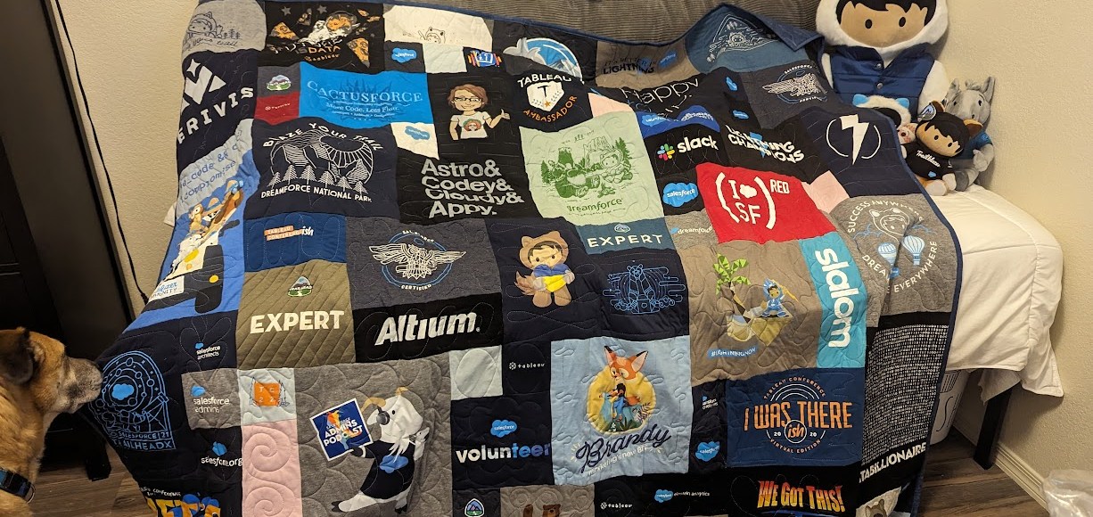 Anyone else have a zillion Salesforce shirts in their closet? I did. I have a set that I wear all the time and others that just get left in the closet forever. I’ve always wanted to make a t-shirt quilt out of them, because even though I don’t wear them too often, they mean a lot to me. Sadly, I never had time to do it, and so I sent them all away to someone else to make it! <– Highly recommend!